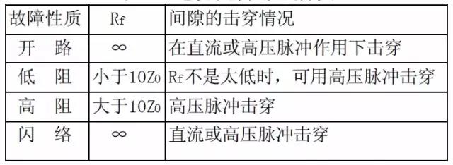 以上分類的目的也是為了選擇測(cè)試方法的方便,根據(jù)目前流行的故障測(cè)距技術(shù),開(kāi)路與低阻故障可用低壓脈沖反射法,高阻故障要用沖擊閃絡(luò)法測(cè)試,而閃絡(luò)性故障可用直流閃絡(luò)法測(cè)試?,F(xiàn)場(chǎng)人員有把Rf<100KΩ的故障稱為低阻故障的習(xí)慣,主要是因?yàn)閭鹘y(tǒng)的