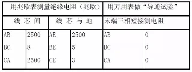 測(cè)量絕緣電阻時(shí),使用兆歐表(1千伏以下的電纜,用1000伏的兆歐表;1千伏以上的電纜,用2500伏的兆歐表)來(lái)測(cè)量電纜線芯之間和線芯對(duì)地的絕緣電阻;進(jìn)行“導(dǎo)通試驗(yàn)”時(shí),將電纜的末端三相短接,用萬(wàn)用表在電纜的首端測(cè)量芯線之間的電阻?,F(xiàn)將一故障電纜的測(cè)量結(jié)果列于表2中,供參考。