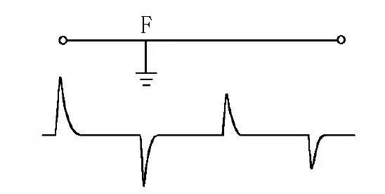 電纜短路故障脈沖反射波形。波形上第一個(gè)故障點(diǎn)反射脈沖之后的脈沖極性出現(xiàn)一正一負(fù)的交替變化,這是由于脈沖在故障點(diǎn)反射系數(shù)為-1,而在測(cè)