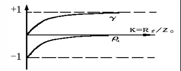 低電阻故障時(shí),故障點(diǎn)電壓反射系數(shù)與透射系數(shù)由式ρu=-1/(1+2K)與γ=2K/(1+2K)給出,其中K=Rf/Z0是故障電阻與電纜波阻抗的比。圖6給出了電壓反射系數(shù)與透射系數(shù)隨K值的變化關(guān)系,可見(jiàn)K>10,即故障電阻大于波阻抗值的10倍時(shí),脈沖反射系數(shù)幅值小于5%,故障點(diǎn)反射脈沖較難以識(shí)別,故低壓脈沖法不適用測(cè)量這類故障的距離。