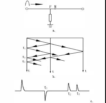 測(cè)試時(shí),向電纜輸入一低壓脈沖,該脈沖沿電纜傳播到阻抗不匹配點(diǎn),如短路點(diǎn)、故障點(diǎn)、中間接頭等,脈沖產(chǎn)生反射,回送到測(cè)量點(diǎn)被儀器記錄下來(lái),如圖1所示: