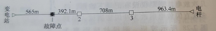 此線路在運(yùn)行中發(fā)生接地故障,用兆歐表測(cè)試三相對(duì)地都為0,改用萬用表測(cè)試,得各相絕緣電阻為:A相對(duì)地 50 kΩ、B相對(duì)地 20kΩ、C 相對(duì)地 10kΩ,診斷此電纜發(fā)生了多相高阻接地古障。電纜敷設(shè)情況如圖 9-1所示。